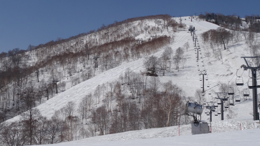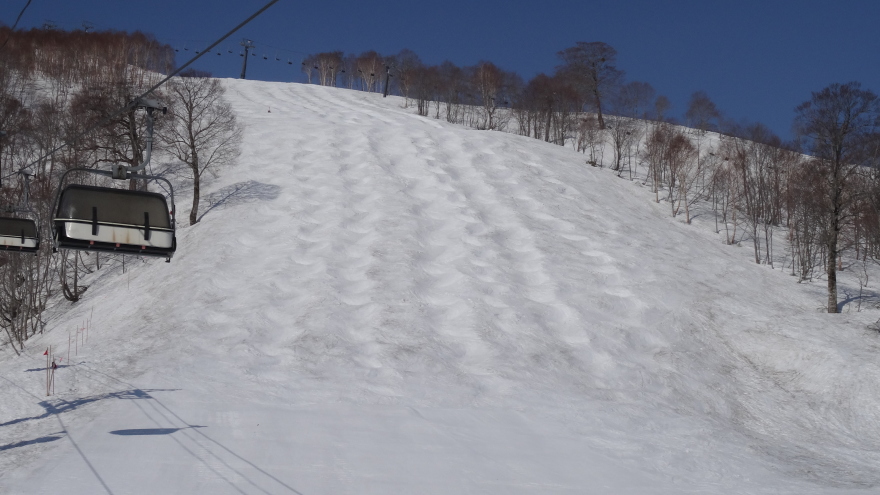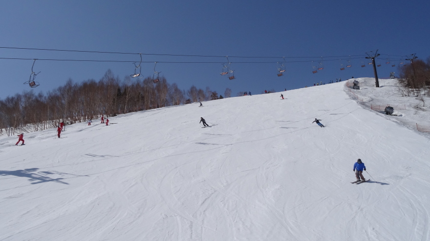 メインゲレンデ。昨日夕方の雨の影響で朝は硬めでしたが、あっという間に緩んできました。