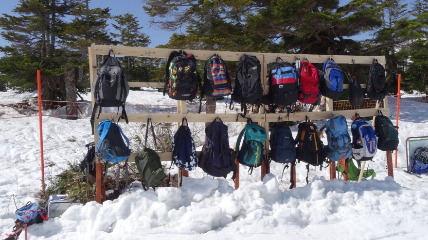 かぐらゴンドラや第一高速リフトの降り場には、ご覧のようなザック掛けが用意。ナイスなサービスですね。