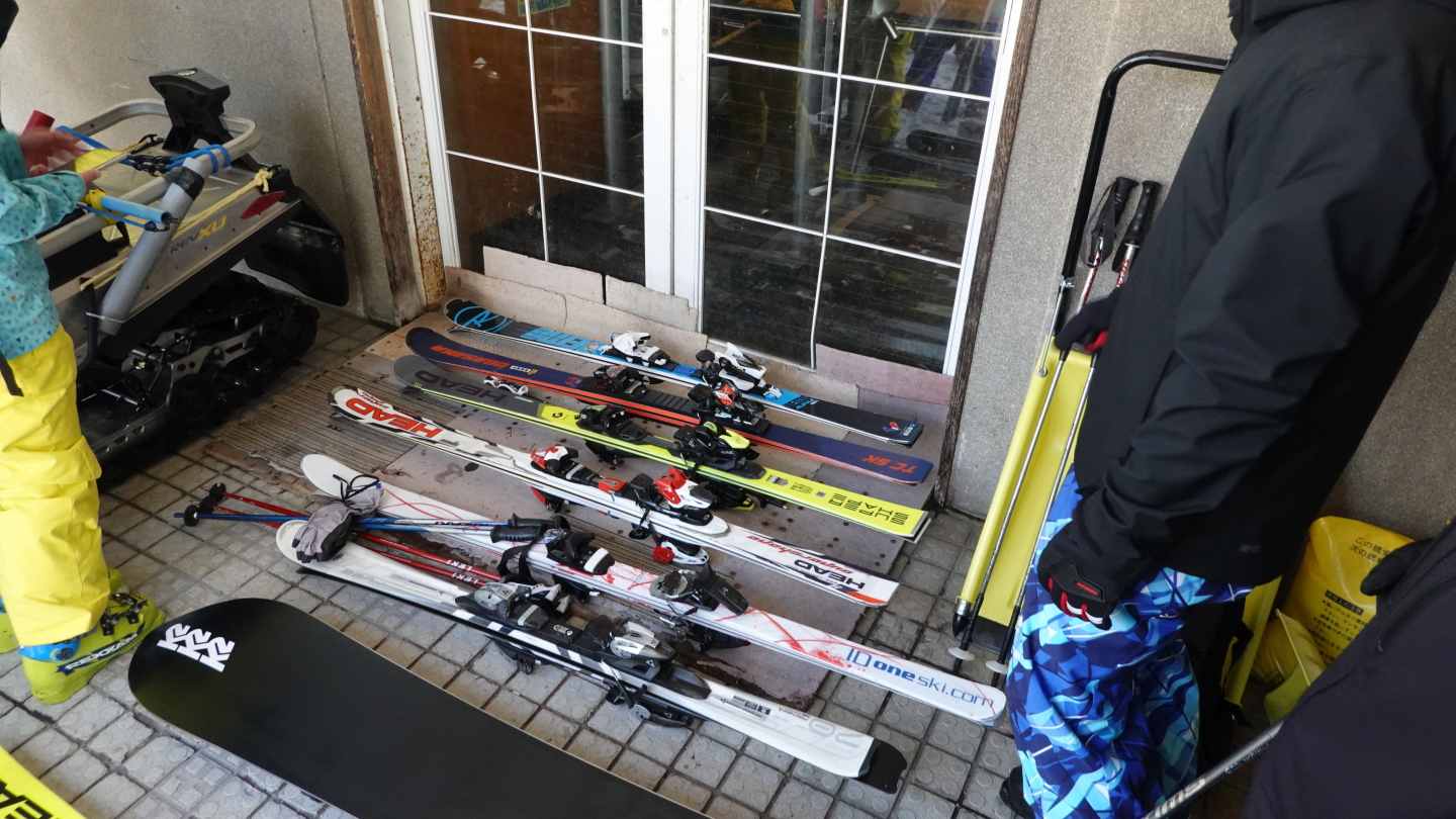 ゴンドラ入口. 常連さんの板が並ぶ中、5番手を獲得. 今回は板同士の間隔が狭いですが、通常は人が立てる間隔を開けるとのこと.板を並べる作法があるとのことです.