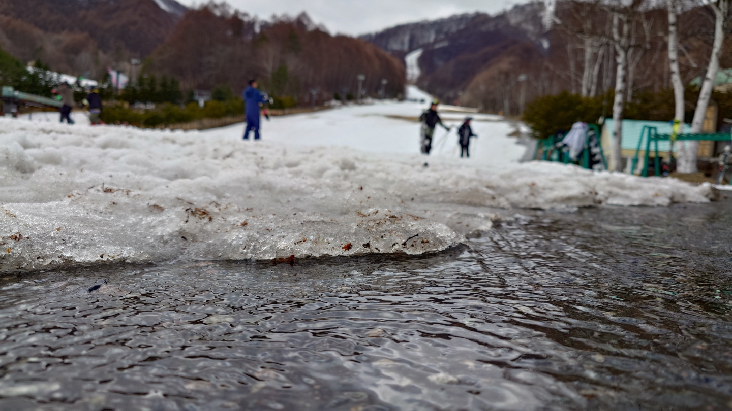 麓は雪解けが進んでいました.ゴンドラ駅舎前は小川が出現.