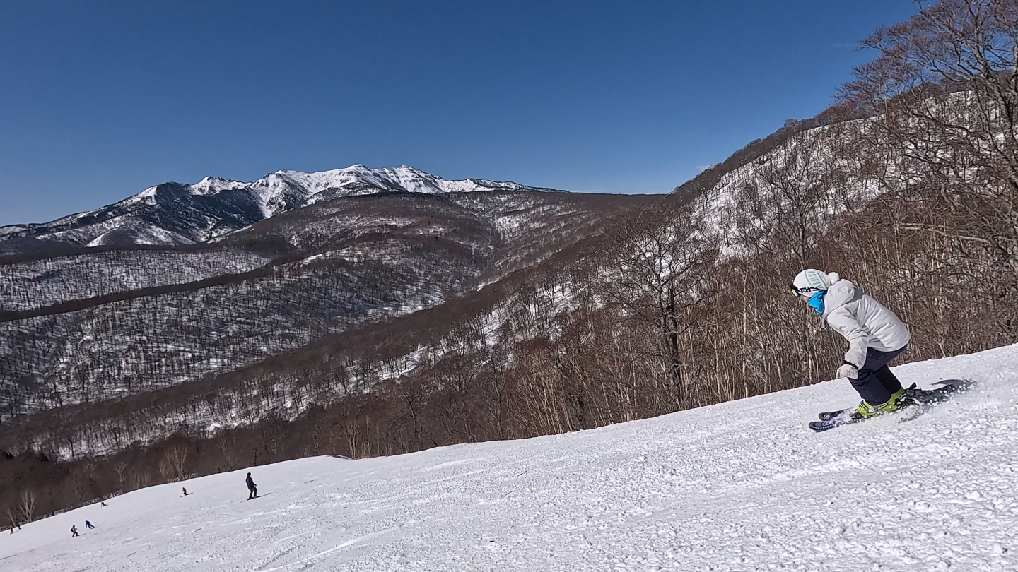 朝のゲレンデは西山エリアでもジャガイモが各所で発生.武尊山を眺めながら滑るとちの木コースはとても気持ちいいところです.